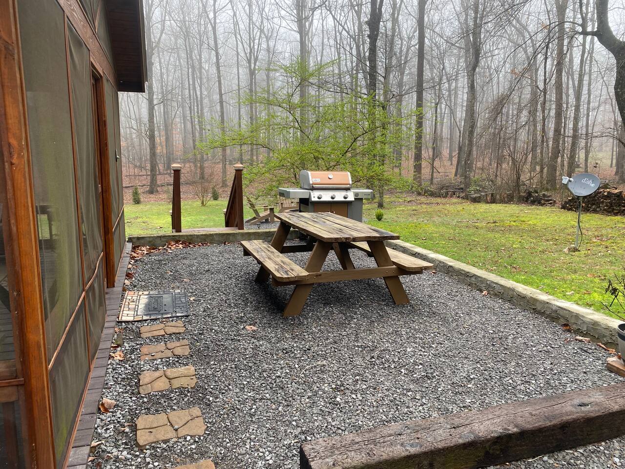 Multiple large parking pads in front and sides of cabin