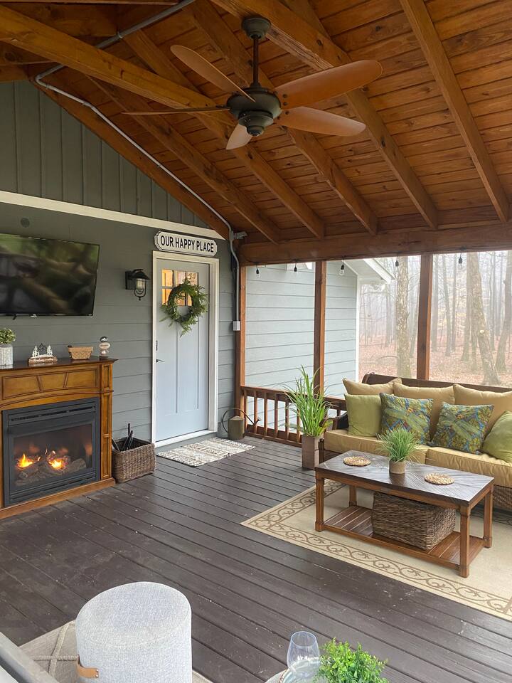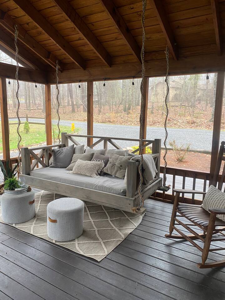 Beautiful cabin close to everything with a screened-in porch complete with bed swing and fireplace. Relax in the 4 person hot tub or gather around the fire pit with a glass of wine and unwind. Perfect place for a girls' weekend, a romantic getaway with your favorite person or reconnect with your family while playing games around the fireplace!